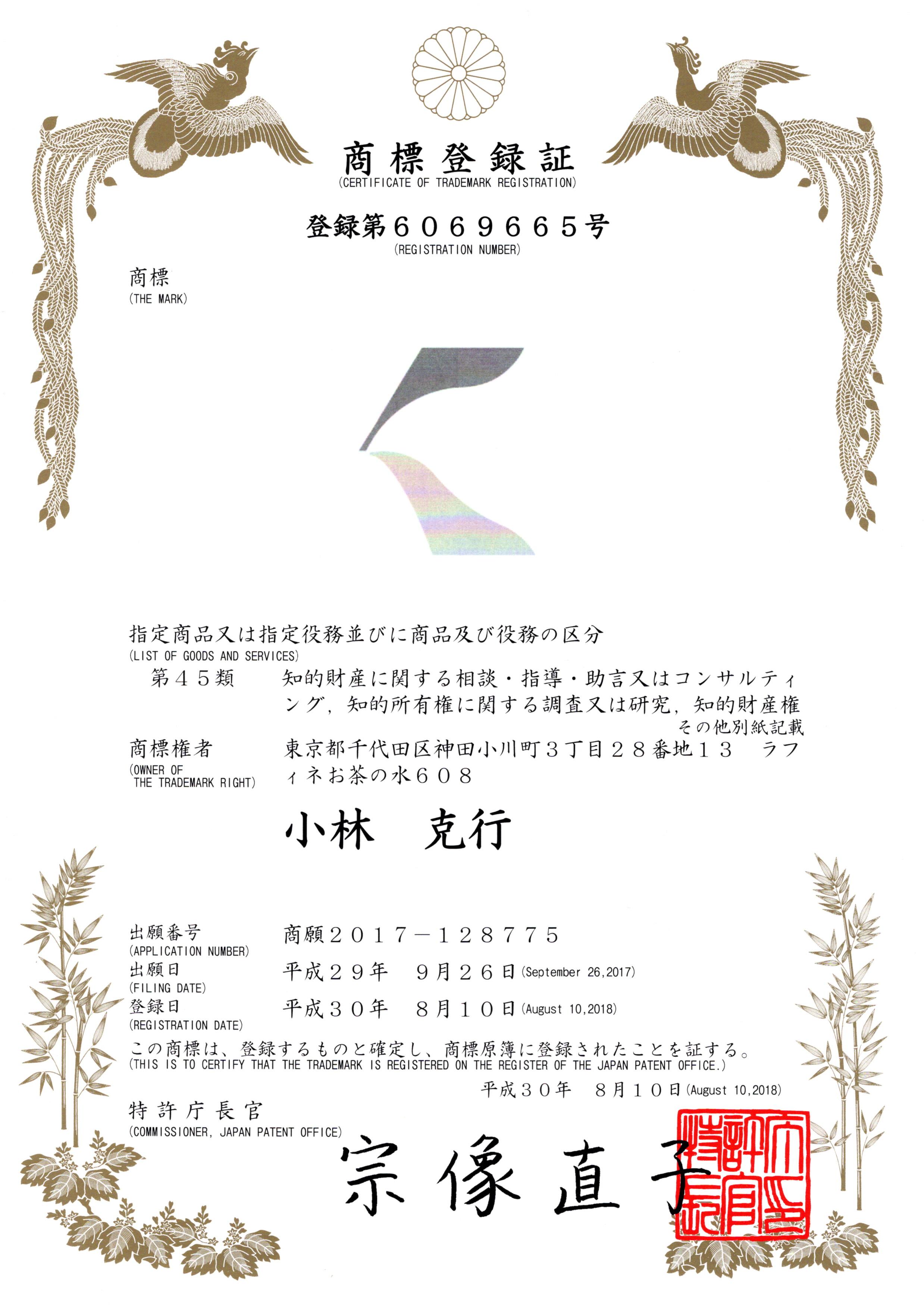 なお、事務所のブランド化を図るべく、Kのロゴ及び「かりん/KARIN」の文字は商標登録しております。 これにより、国内で上記商標と同一・類似の商標をその指定した役務(サービス)と同一・類似の役務に使用できるのは私のみとなっております。