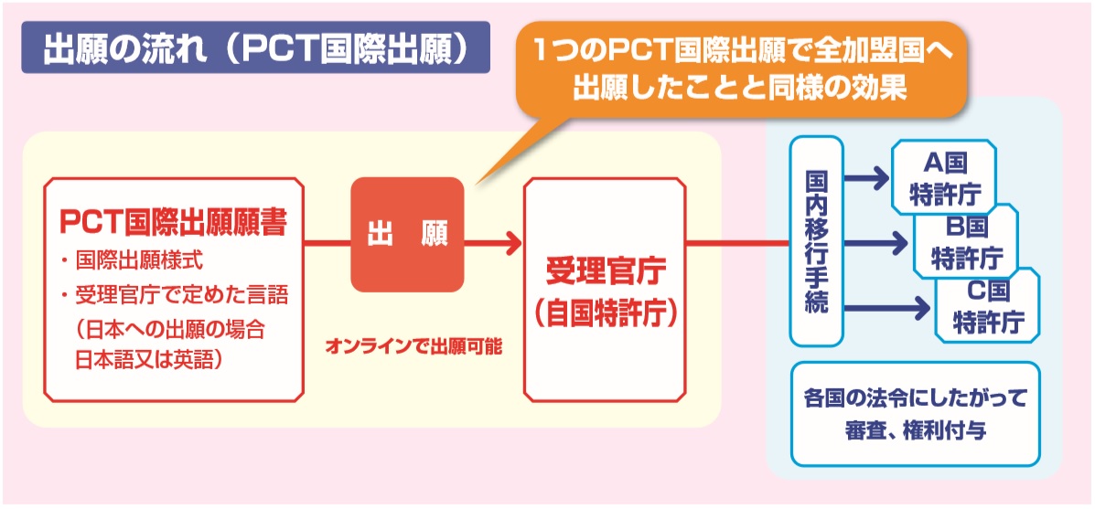 ひとつの出願願書を条約(特許協力条約(PCT:Patent Cooperation Treaty))に従って提出することによって、PCT加盟国であるすべての国に同時に出願したことと同じ効果が与えられる制度です。
